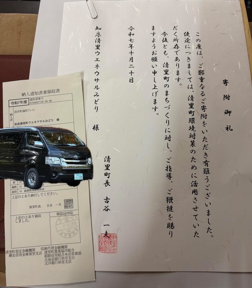 10/5 に開催しました第五回知床清里クリーングリーンにご参加いただきました皆様から頂戴したツアー参加費の50%を、清里町役場総務課へ寄付させていただきました