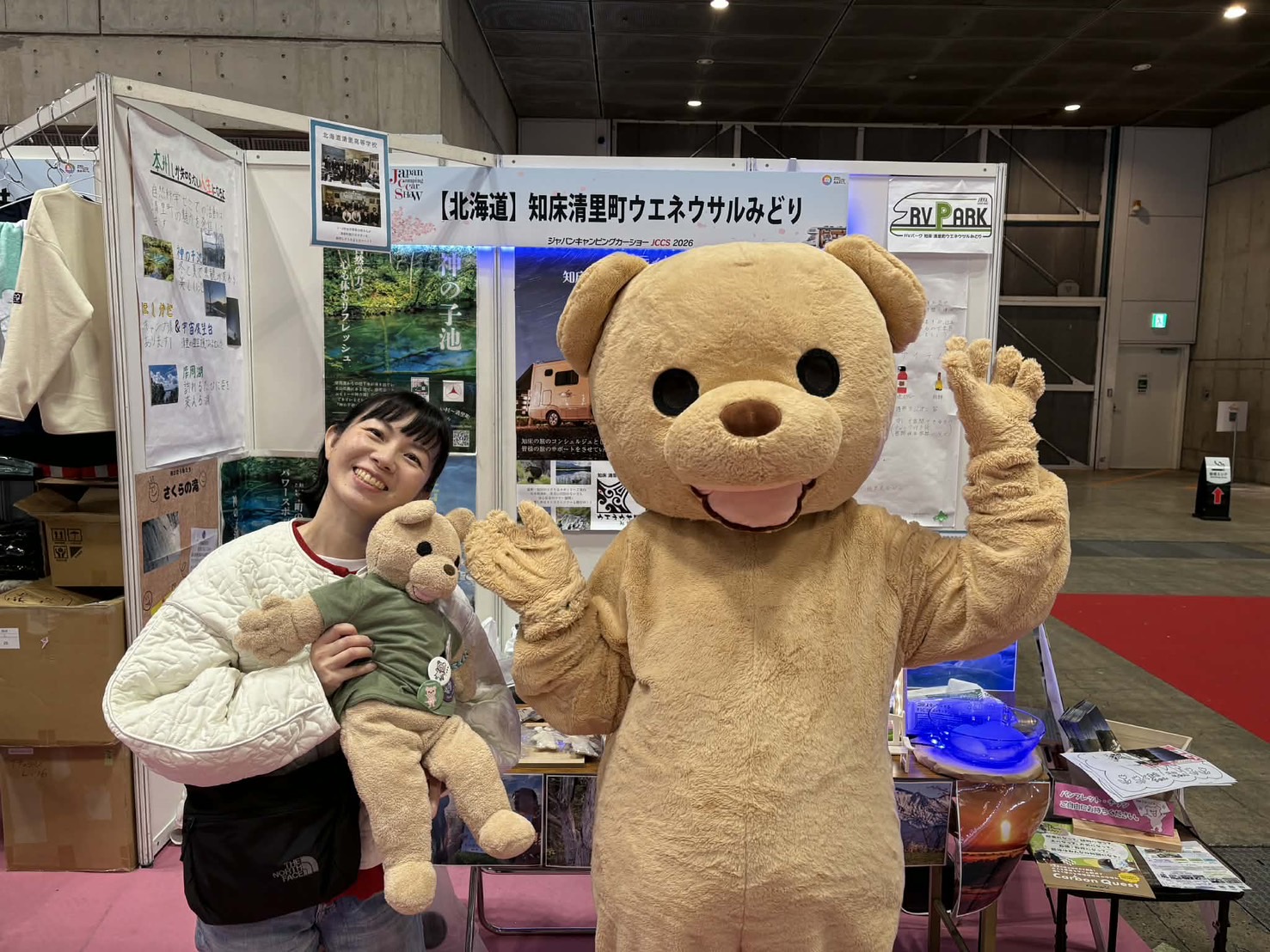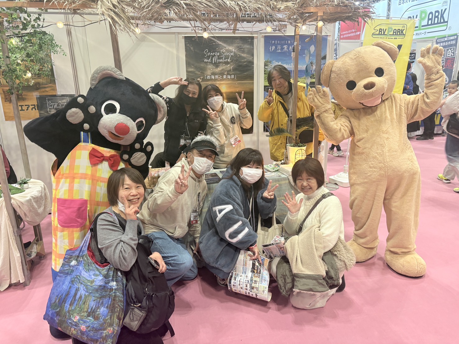 ウエネウサルの「くまもちゃん」と劇団こぐま座「コロちゃん」のコラボで私たちのブースだけではなくツーリズムゾーンのブース皆様を盛り上げました